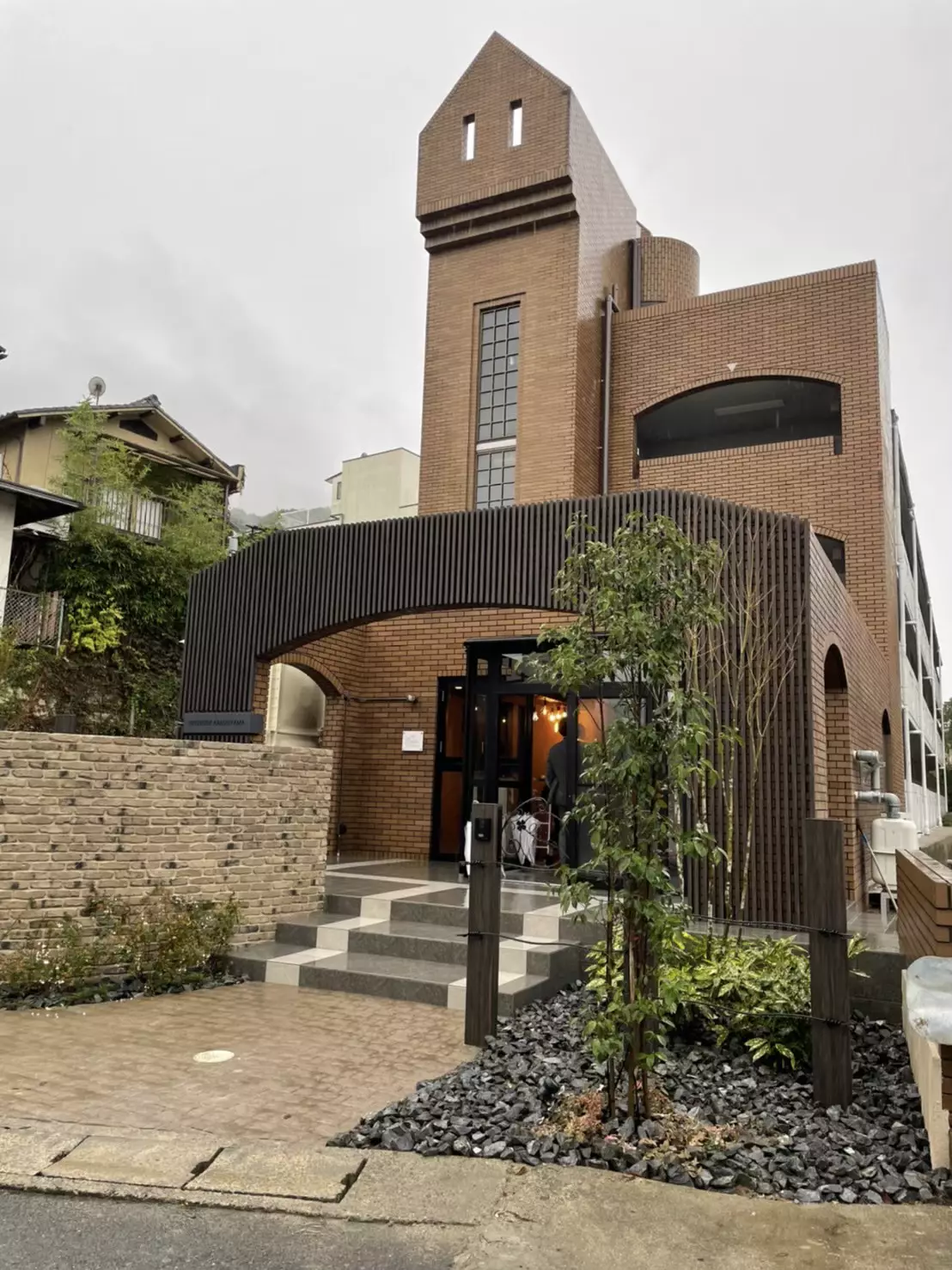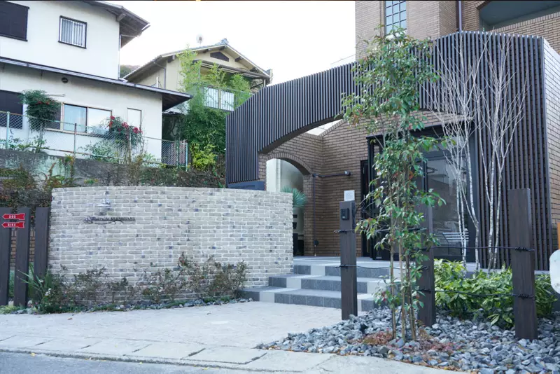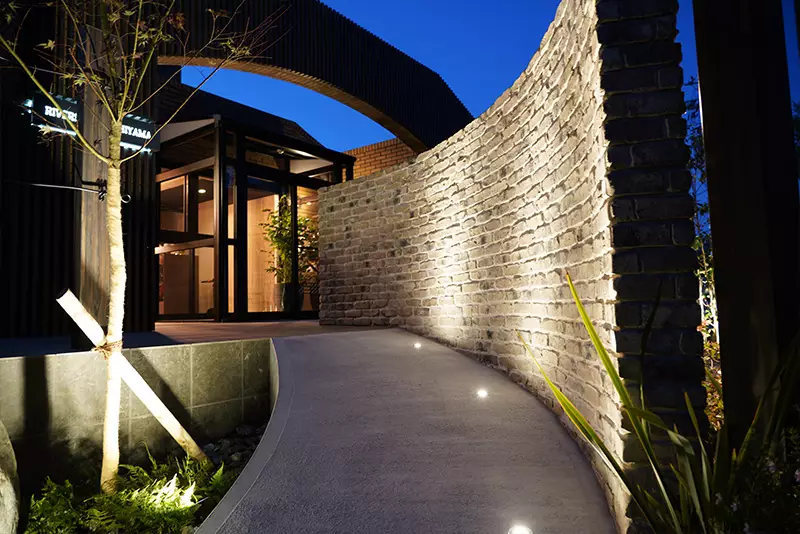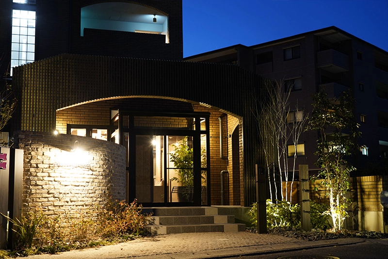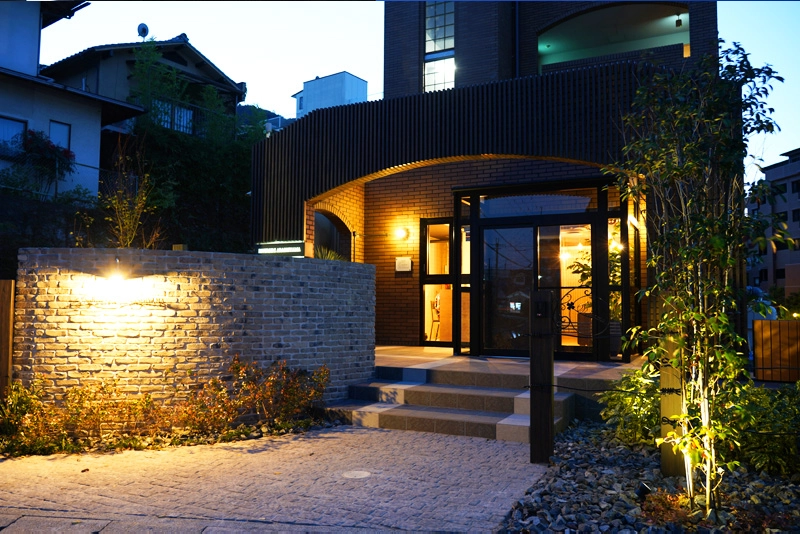 室内はロードバイクを持ち込みながら滞在が出来る設計になっている中で、当社の外構ではファサード部分の印象を悪くならない様なスロープの設計を採用 夜も足元灯があり、安全にエントランスまで導ける様に設計しました。