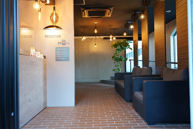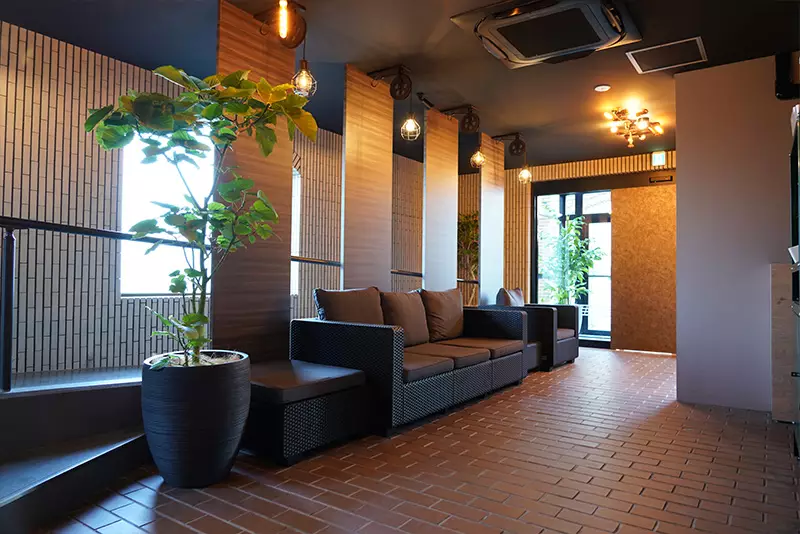 レセプションには弊社が海外のメーカーより、直接取引している植木鉢やガーデン家具を採用頂き、 統一感のある空間のご提案が出来ました。レセプションのソファは常に清潔に保てる屋外家具を採用(=KETER Salta Loung set ケター サルタ ロングセット)