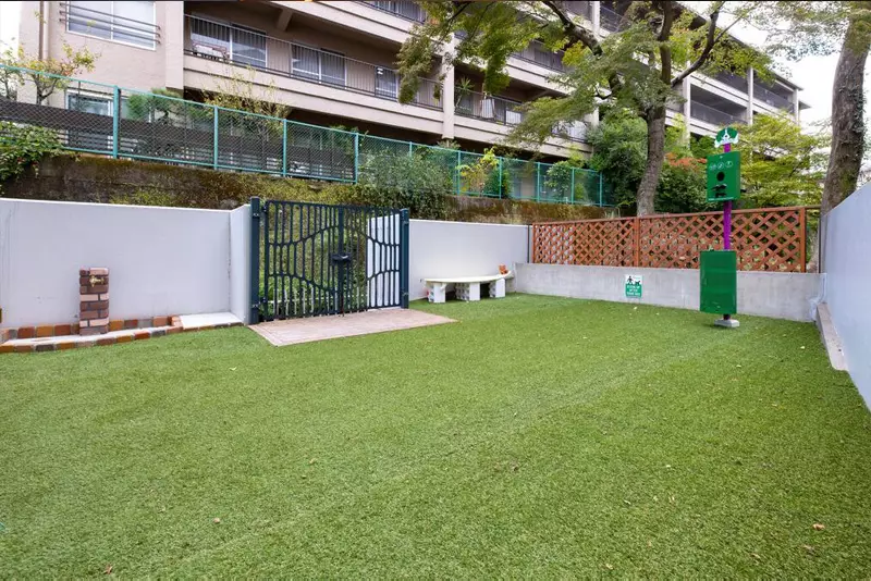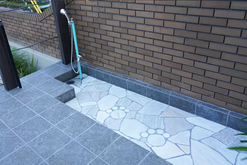 『愛犬との宿泊』屋外空間設計時には、ワンちゃんでも滑らないタイルの採用。 足洗い場には、ワンコの手形。リードフックも愛犬家の方がワクワクするデザイン。