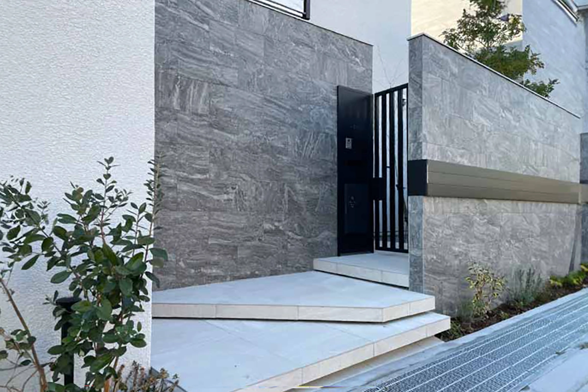 道路から見える袖壁には、300×600角の大理石調タイルを採用。