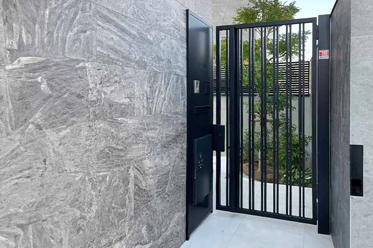 門扉はオーダーメイドのロートアルミ製電気錠仕様。