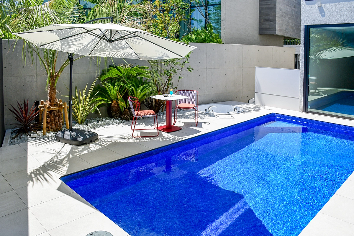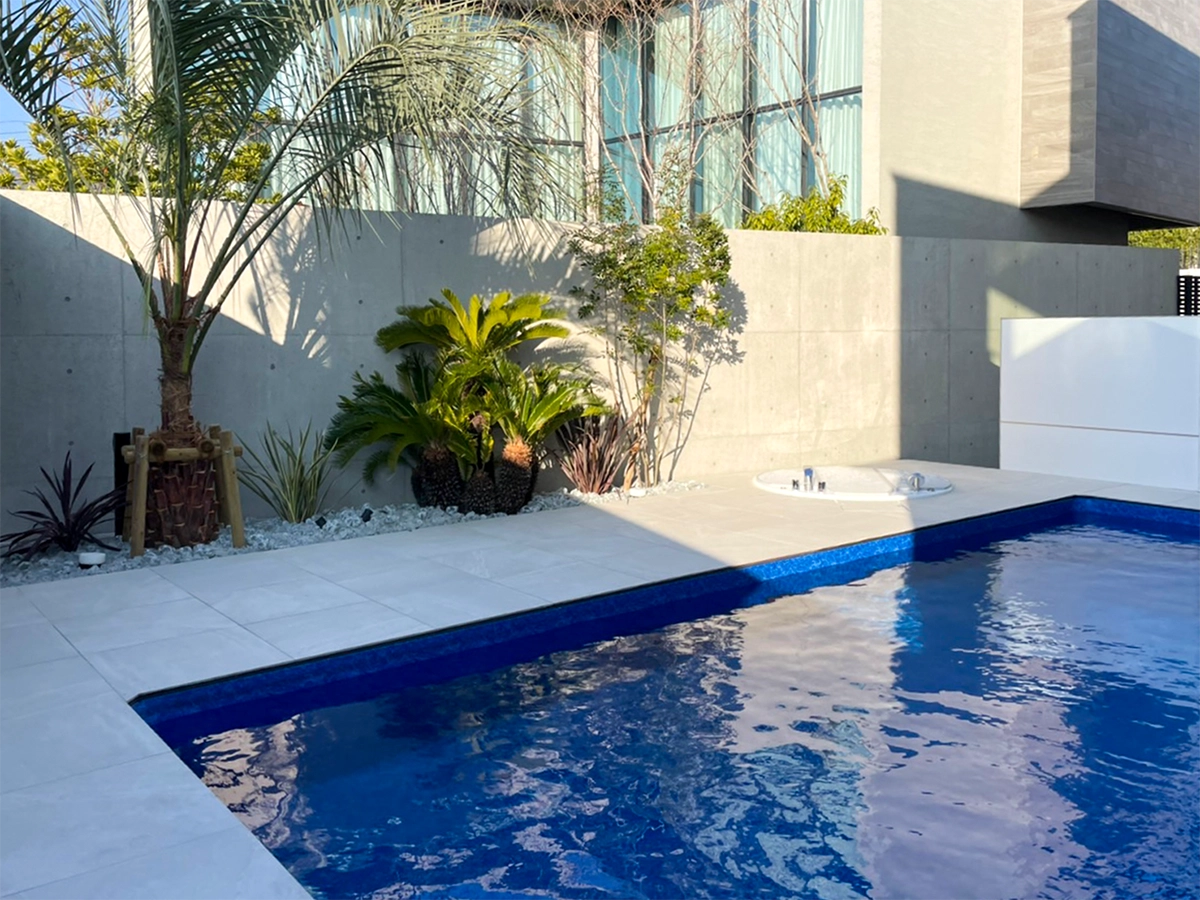 白いタイルと青い水面のコントラストが美しく、海外リゾートのような雰囲気を演出しています。