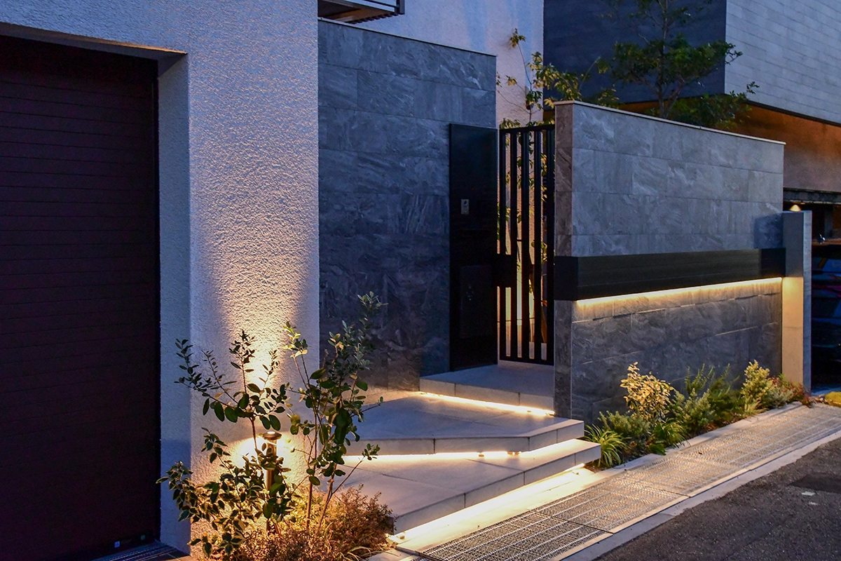 フロート階段のステップにはLED照明を仕込み、夜間も安全で美しいアプローチを実現しました。