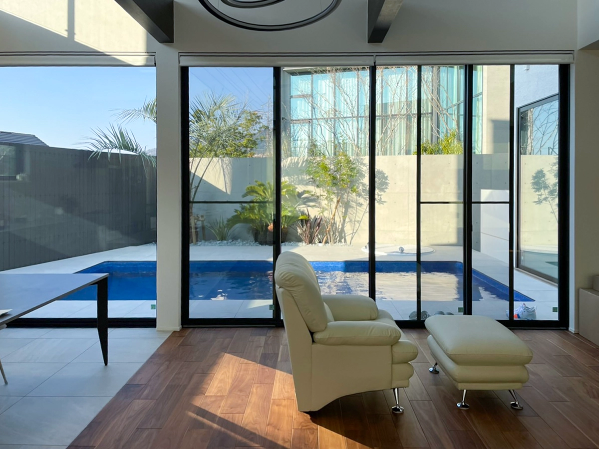 お庭の中心には温水対応のプライベートプールを設置。