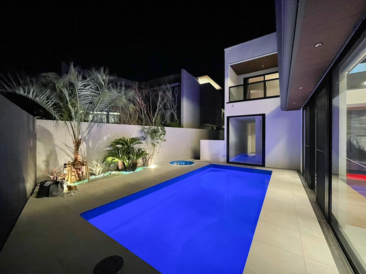 お庭のメインスペースにはプライベートプールを施工。