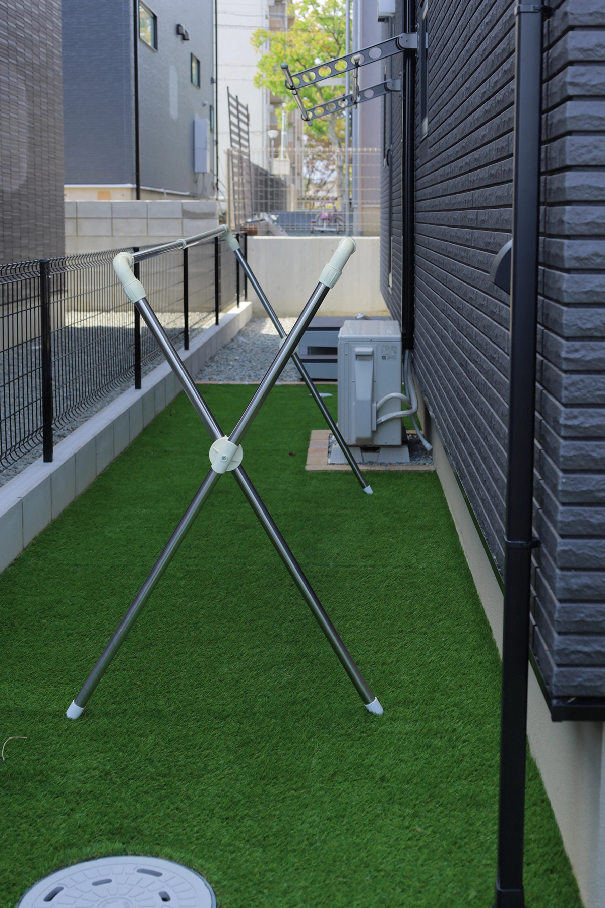 建物横の犬走りにも人工芝を敷設。