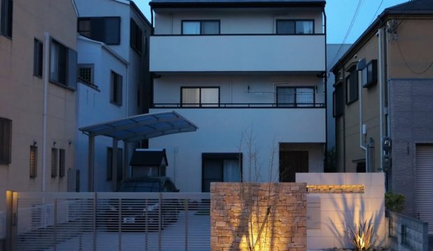 門まわりには大理石調タイルを使用した袖壁を設け、敷地を最大限に活かしたRC造のシャッターゲートを配置。