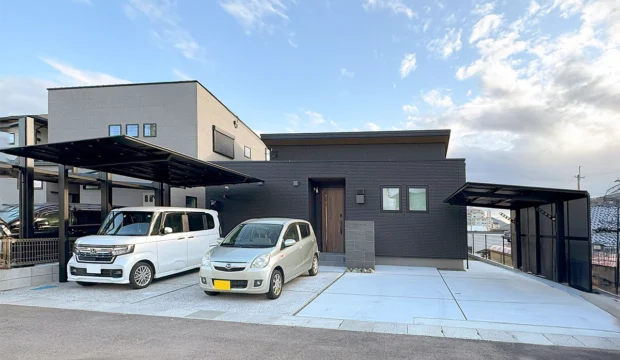 駐車スペースを4台分確保することを前提に、雨の日でも玄関まで傘を差さずに行き来できる動線を重視して計画を進めました。