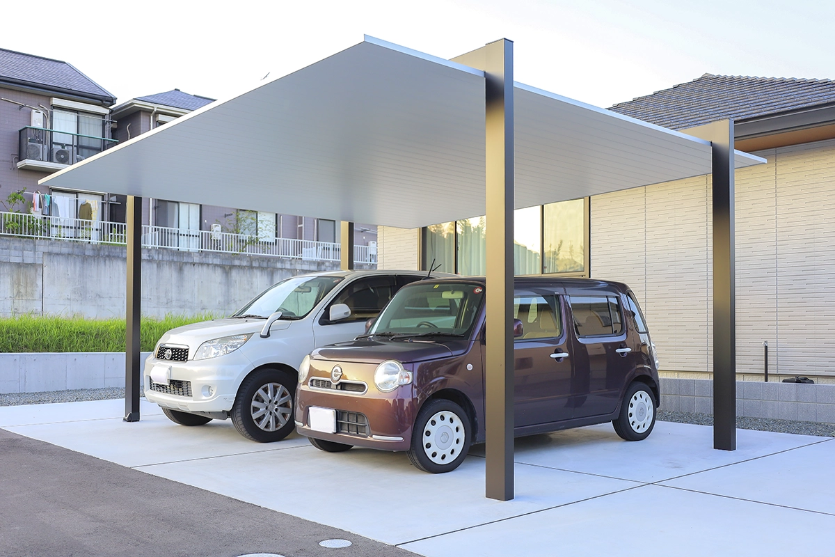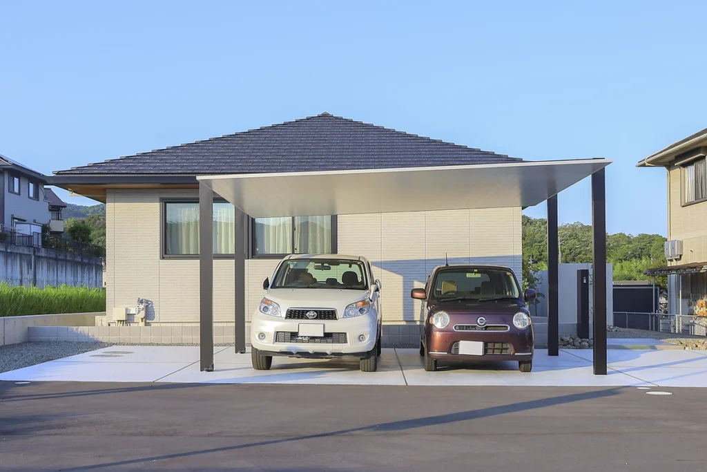カーポートSC(ブラック×ナチュラルシルバーF)のシャープなデザインが全体を引き締め、洗練された印象に。