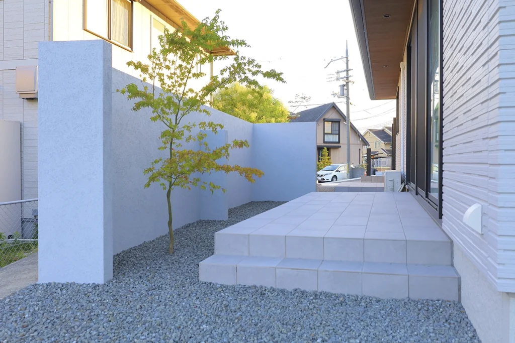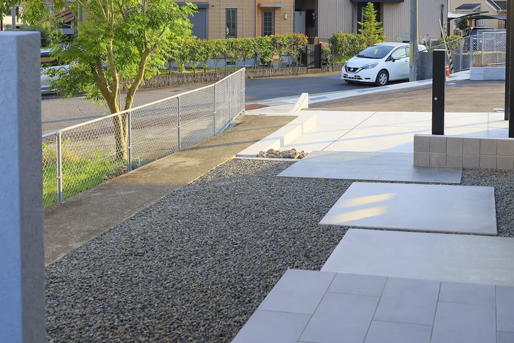 外構全体はライトグレーを基調とし、建物の外壁と調和するシンプルな配色で統一。