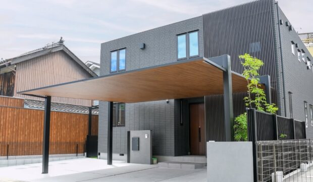 全景。印象的な木目調のカーポート天井材。そして、すらっと聳え立つアオダモが目を惹きます。セミクローズされた門回りは300×600サイズのタイルがダイナミックさを表現する一方、グレーの色味にすることで上品さを意図。建物の軒天、ルーバーとのバランスも考慮した絶妙なデザイン。