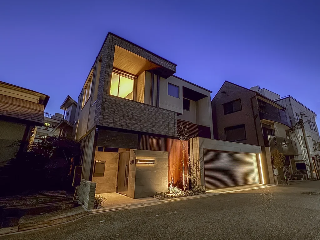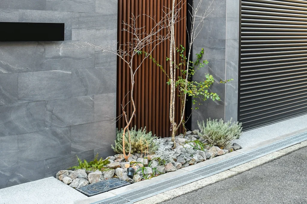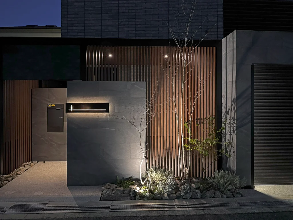 木調の格子が外観全体に温かみを添え、グレーのタイルウォールと美しく調和しています。