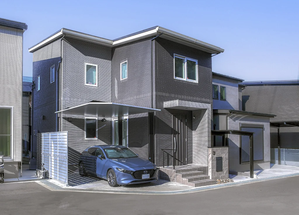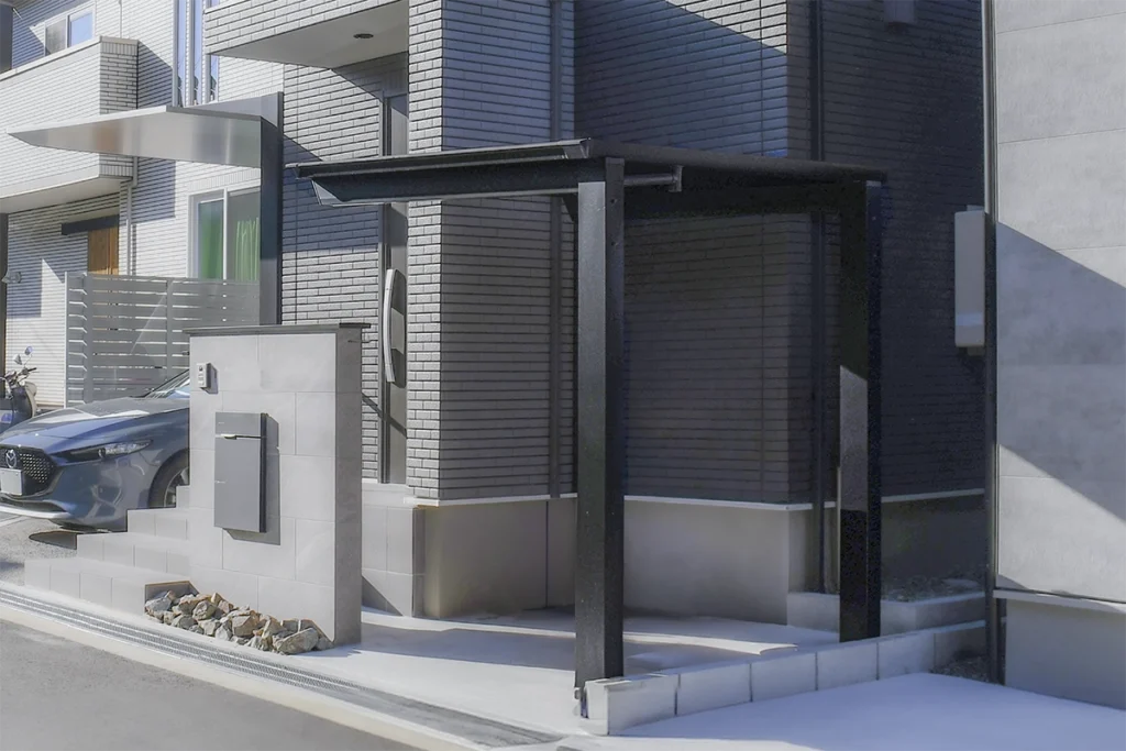 ツートンカラーのカーポートとも調和し、外構全体にリズムと統一感をもたらしています。