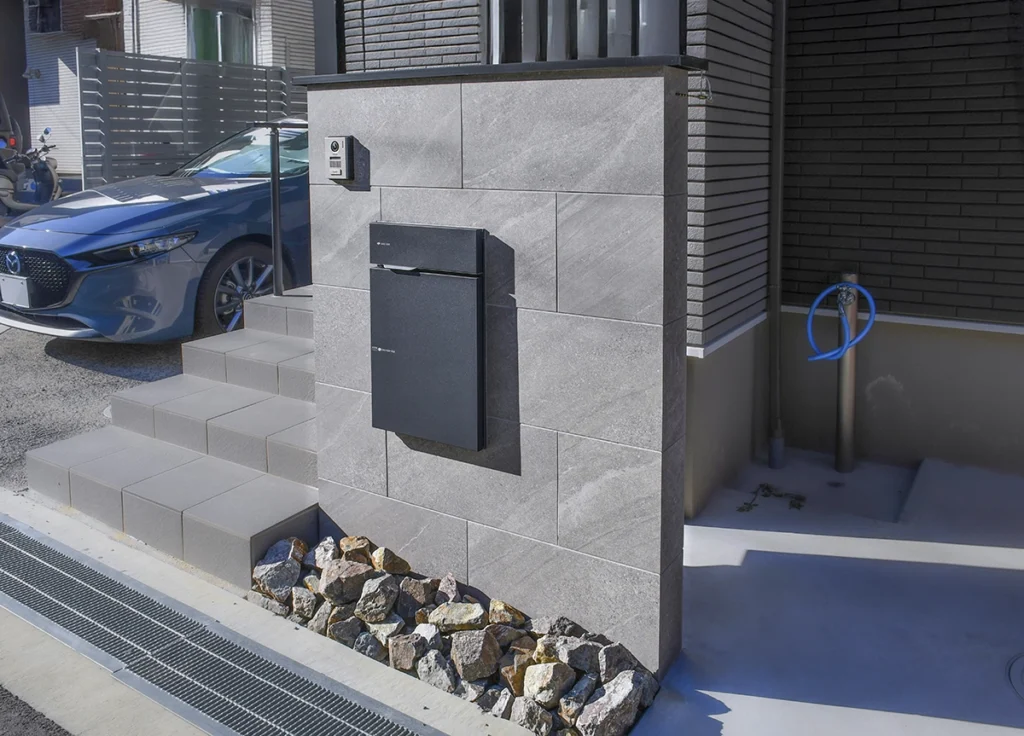 ポストと宅配ボックスは一体型のすっきりとしたタイプを選び、見た目の統一感を確保。