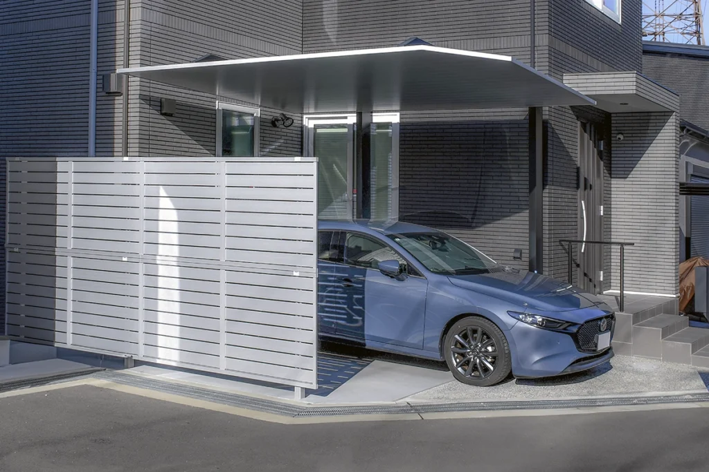 カーポート横には多段フェンス「LIXIL AB YS3型」を採用。