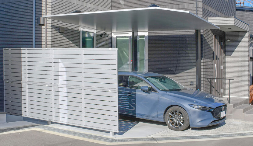 カーポートの梁延長で快適な空間に。シンプルにまとめるモノトーン外構 T様邸