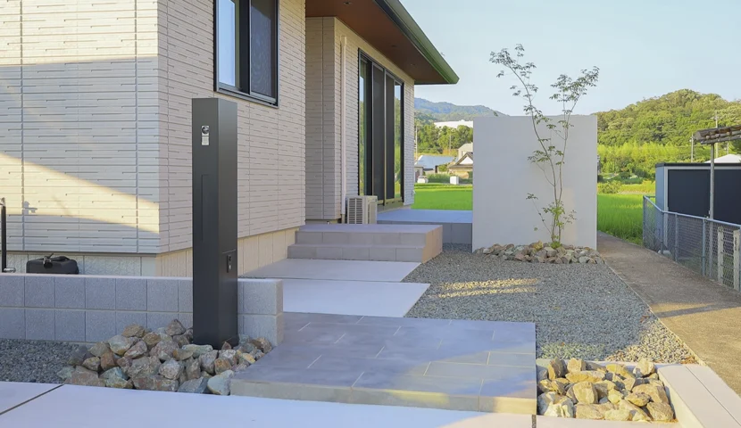 ガビオンが目を惹く、自然素材と直線美が調和したオープン外構 和歌山県海南市 K様邸