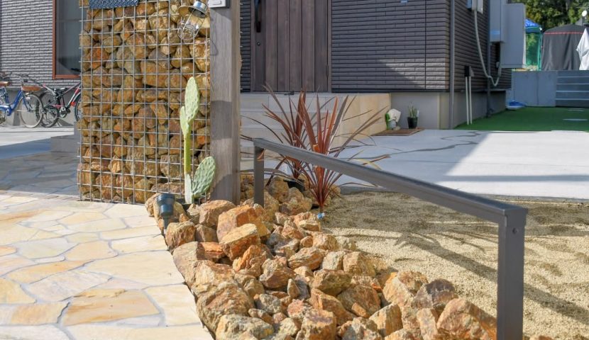 ガビオンが目を惹く、自然素材と直線美が調和したオープン外構 和歌山県海南市 K様邸