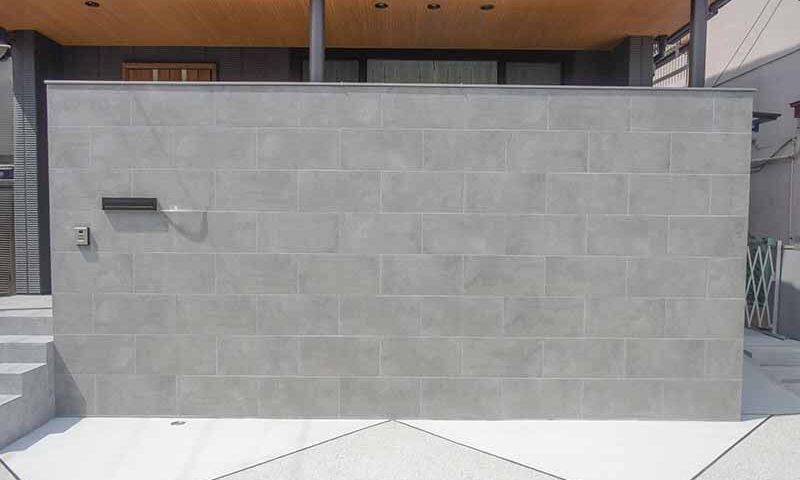 大きな門柱のタイル壁でリビングを目隠ししたスタイリッシュなオープン外構 大阪府堺市